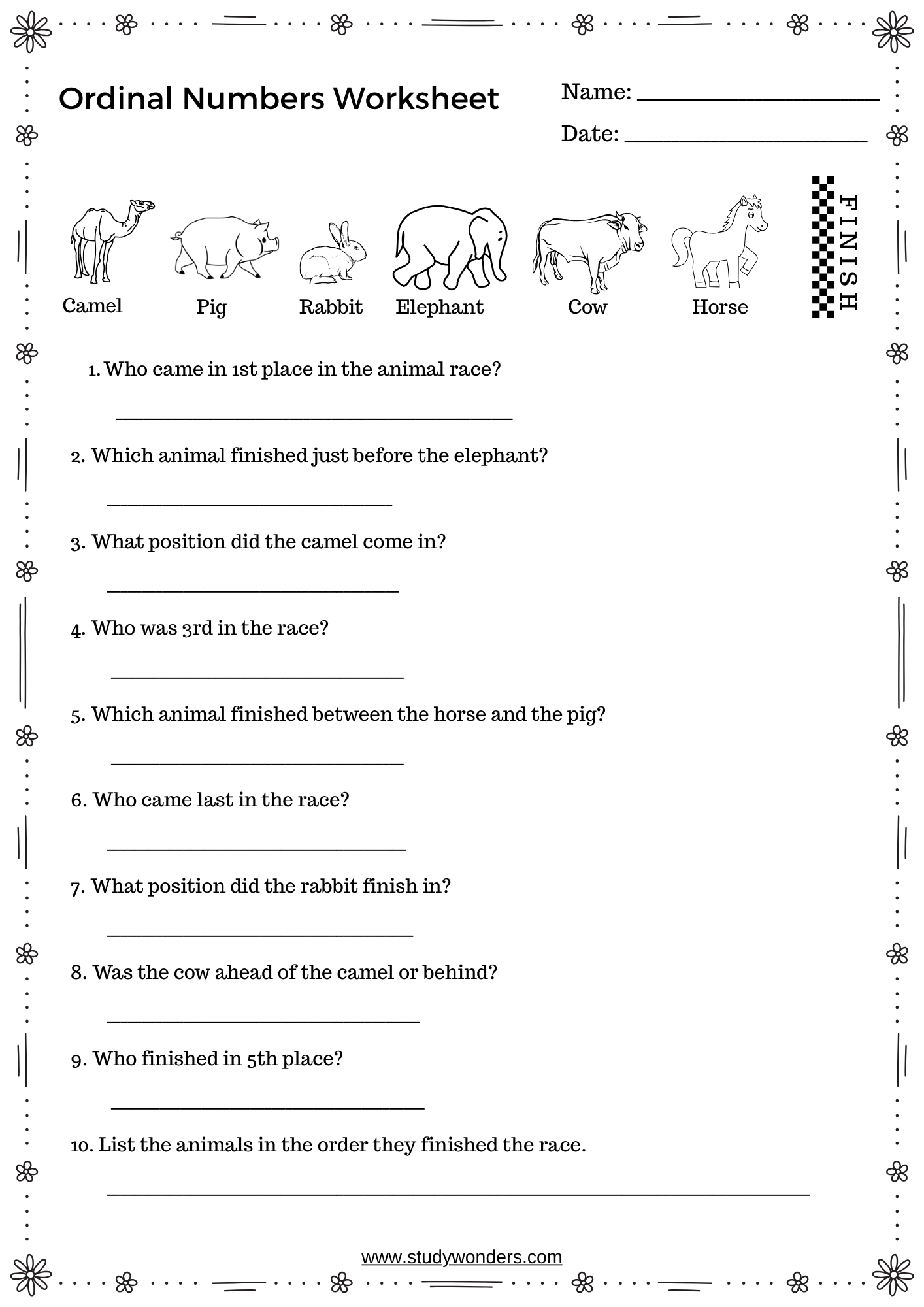 - Worksheet 1: Match pictures to ordinal positions (1st to 10th).